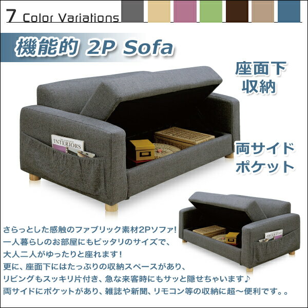 2Pソファ 【サイズ】幅126cm×奥行き69cm×高さ61.5cm(SH:40cm) 【材 質】ファブリック、Sスプリング、ウェービングベルト、 ウレタンフォーム 【カラー】グレー、イエロー、ピンク、グリーン、 チョコレート、ベージュ、ターコイズ 【仕 様】両サイドポケット、座面下収納庫、脚なしで利用可能 【備 考】輸入品、完成品(脚のみお客様にて取付) 【送 料】送料無料(※北海道・東北・沖縄・離島等の一部地域を除く)